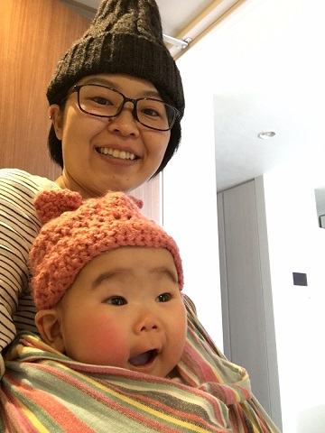 ▲ママ手編みのニット帽をかぶってゴキゲン!
