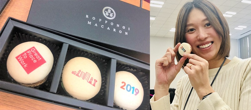 お土産にいただいた特製マカロンは、来週から産休に入る熊本に食べてもらいました。(元気な赤ちゃん生んで戻ってきてね!)