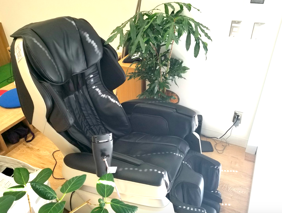 足の裏〜手までマッサージ可能なとても優秀なマッサージチェアはオフィス一番人気。