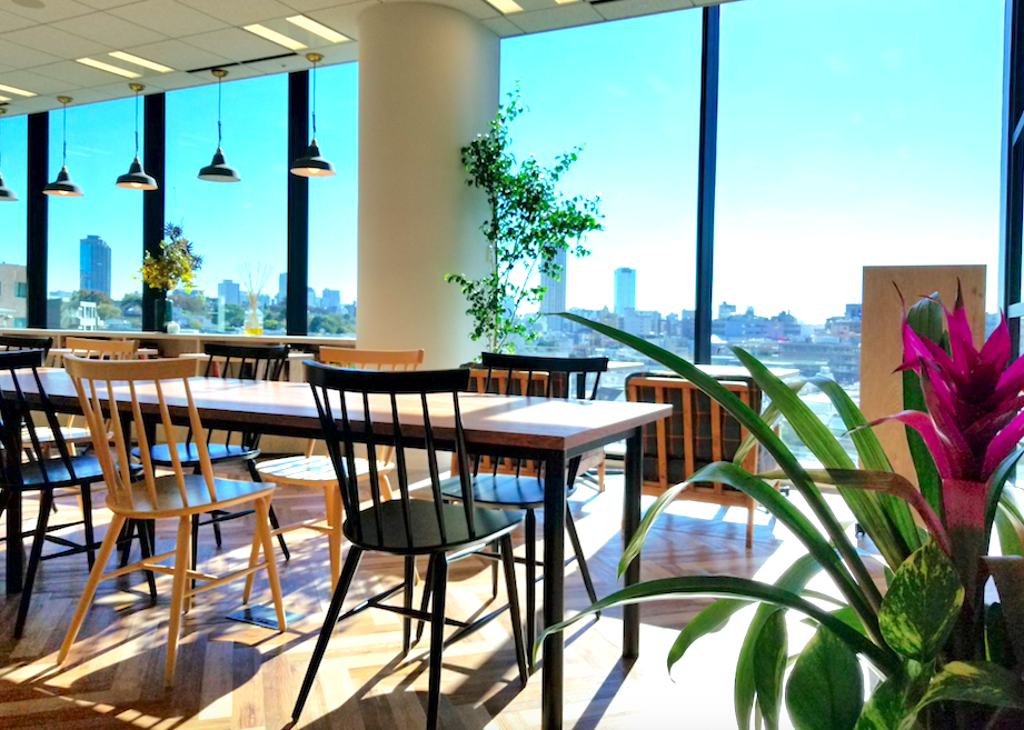 ランチを食べながらメンバーとリラックスしたり、個人作業やMTGをしたり、そして時には勉強会を開催したりと使い方さまざまなカフェスペース。日当たりもとてもよく、開放感があるスペースになっています。