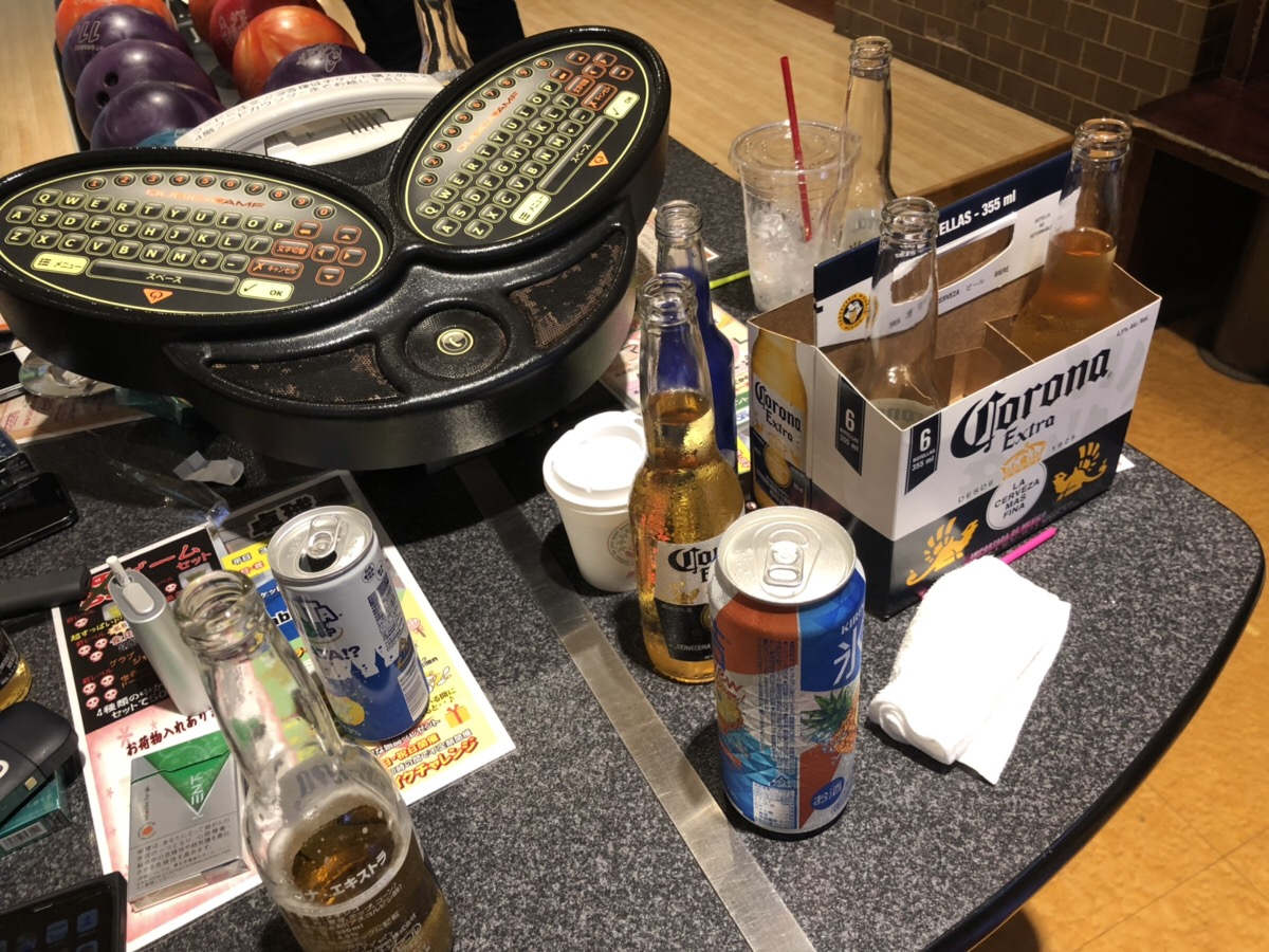 真剣勝負してるレーンのテーブルとは思えない、お酒の散らかりようですね。