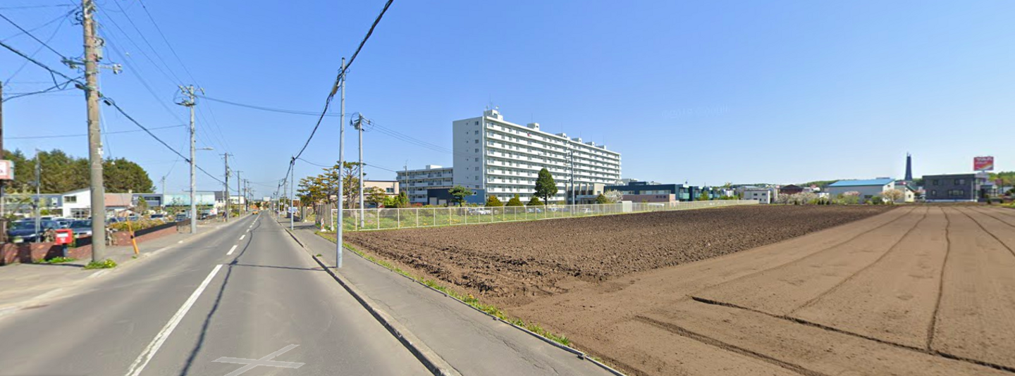 奥に見えるマンションが住んでいたところです。トウキビとジャガイモ畑が広がっております。