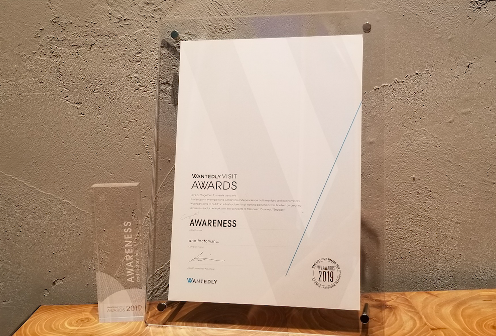 先日行われたWANTEDLY VISIT AWARDS 2019に参加させていただき、and factoryは『Awareness AWARD』をいただきました🎉🎉🎉