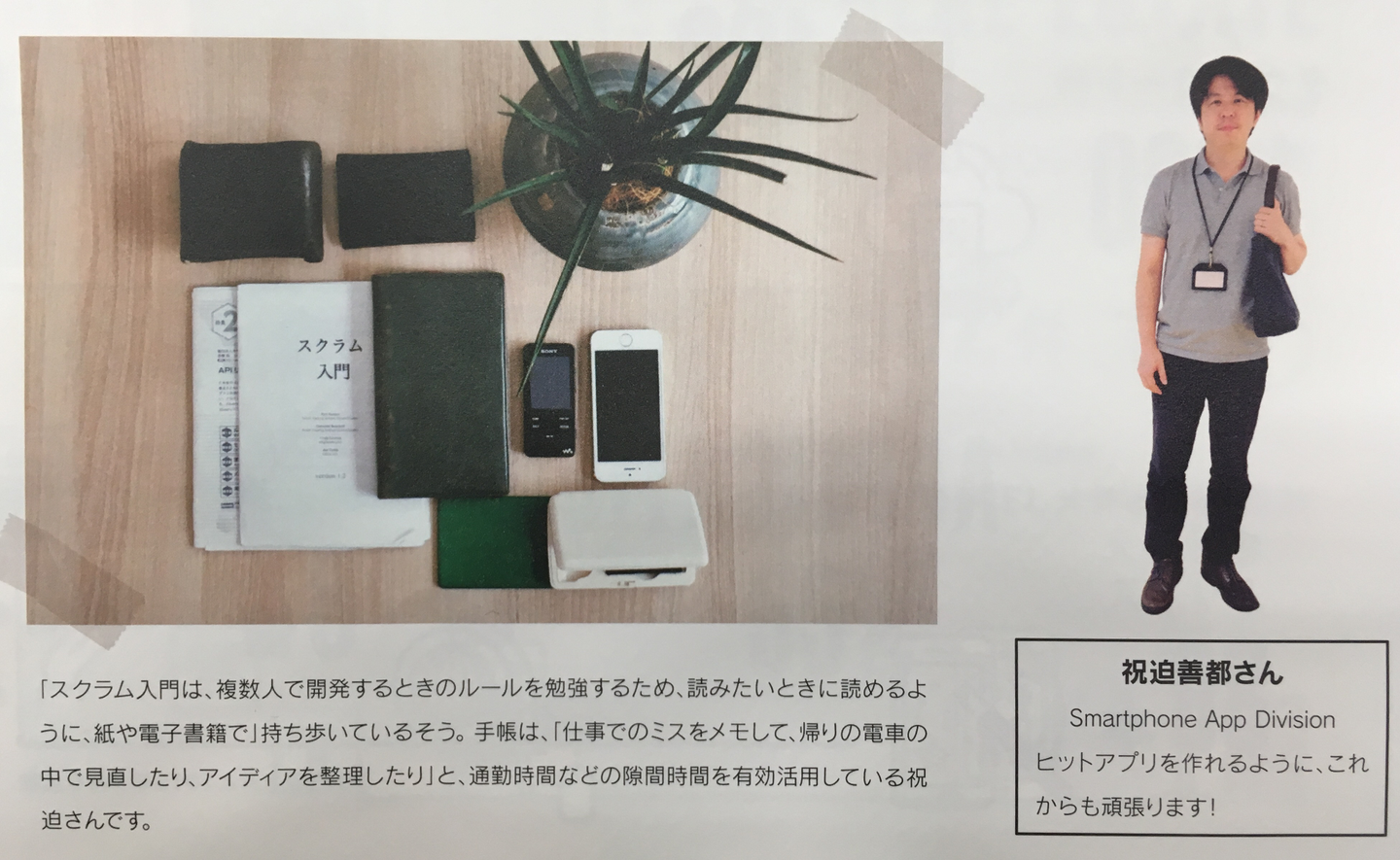 ▼社内報で掲載した祝迫のカバンの中身。いつでも勉強できるように資料を持ち歩いている。