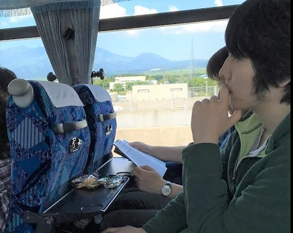 ▼社内旅行の道中。バスの中でも教本に目を通していました。(窓側に座っているのが祝迫)