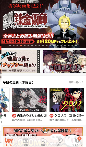 「マンガUP!」は毎日10作品以上をアップ!ドラマ化・映画化が決定している「咲」など常時100タイトル以上の作品が読める国内最大級のマンガアプリ