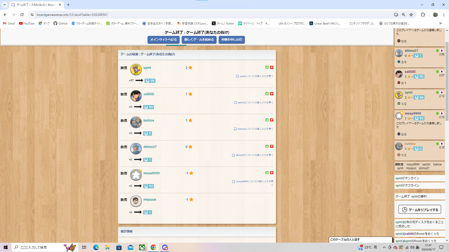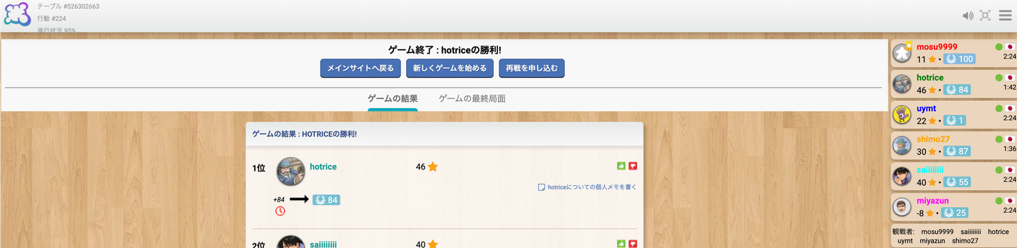 最後はひっそりと潜みつつ、ここぞというタイミング宣言をし花を捲り切ったUさんが勝利を収めました!