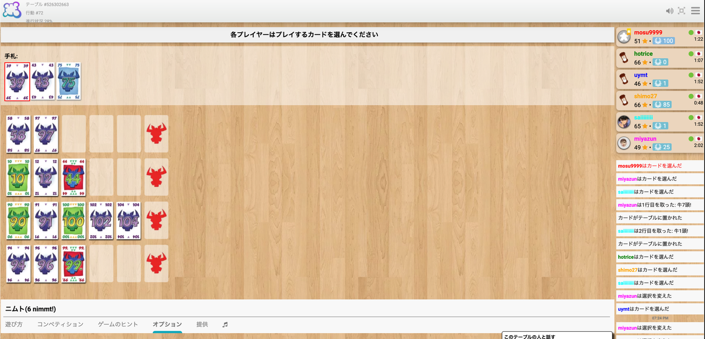 まずはアイスブレークとして「ニムト」をプレイします。これは牛(マイナス点)を取らないように立ち回るゲームなのですが、プレイヤーの一人が圧倒的な運のなさでマイナスカードを引きまくり、場を沸かせます!
