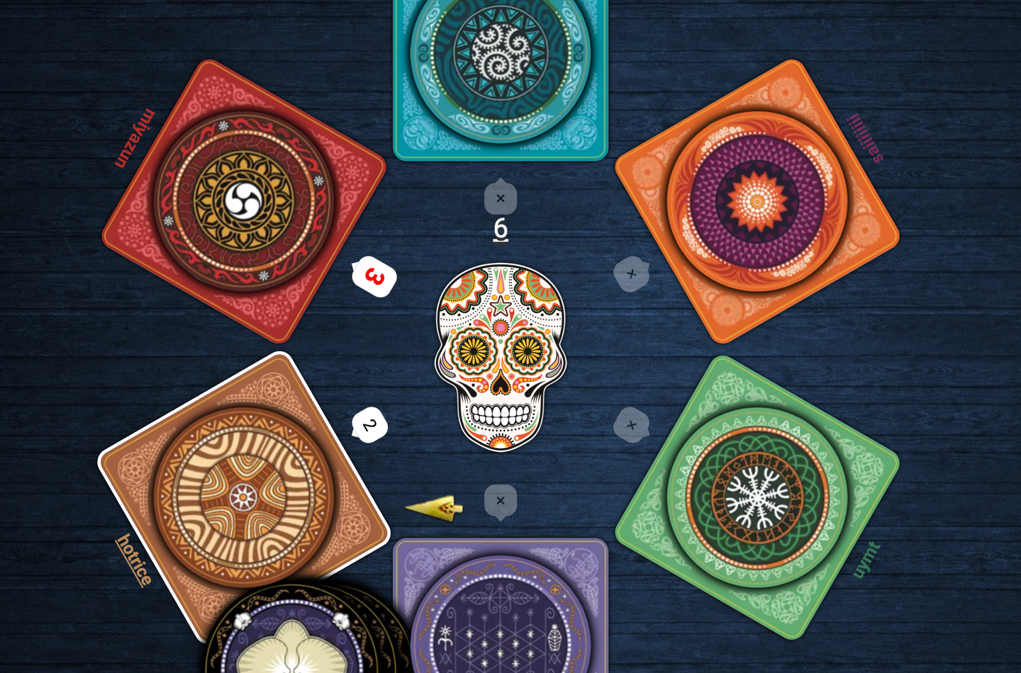 ゲームの大まかなルールとしては、花かドクロのカードをセットしたうえで何枚花があるかを複数人で宣言しあって自分の所→他の人の所の順番でめくっていき、めくれたら一ポイント、ドクロが出たら失敗で二ポイント取ったら勝ちというゲームです。