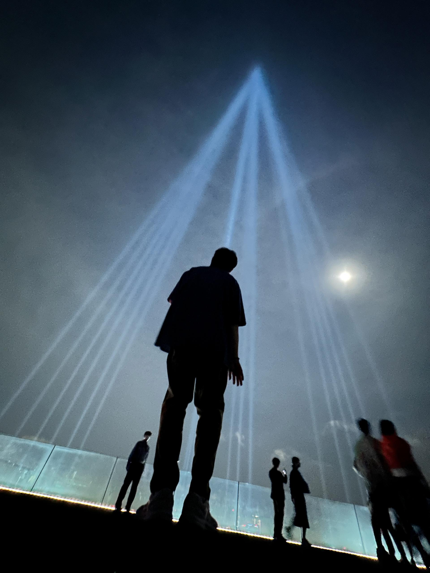 この写真ではわかりづらいですが、青い光で空まで届くような強い光でした