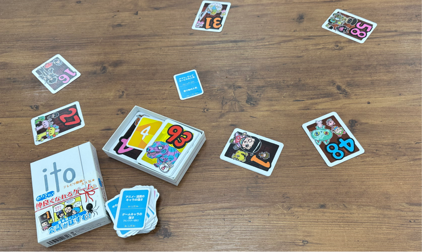 一通りダービーカジノを楽しんだあとはITOというゲームをプレイしました。これは色々なお題に関して100が最高!、1が最低として大体数値にあった答えを言っていてみんなで低い方から順番に当てられれば勝ち、というゲームでした!