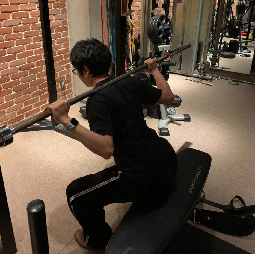 続いてスクワットです。バーを乗せる位置と目線が素晴らしいです。ちなみにこのバー自体は20kgあるのですが、初めて持つと意外と重く感じます。