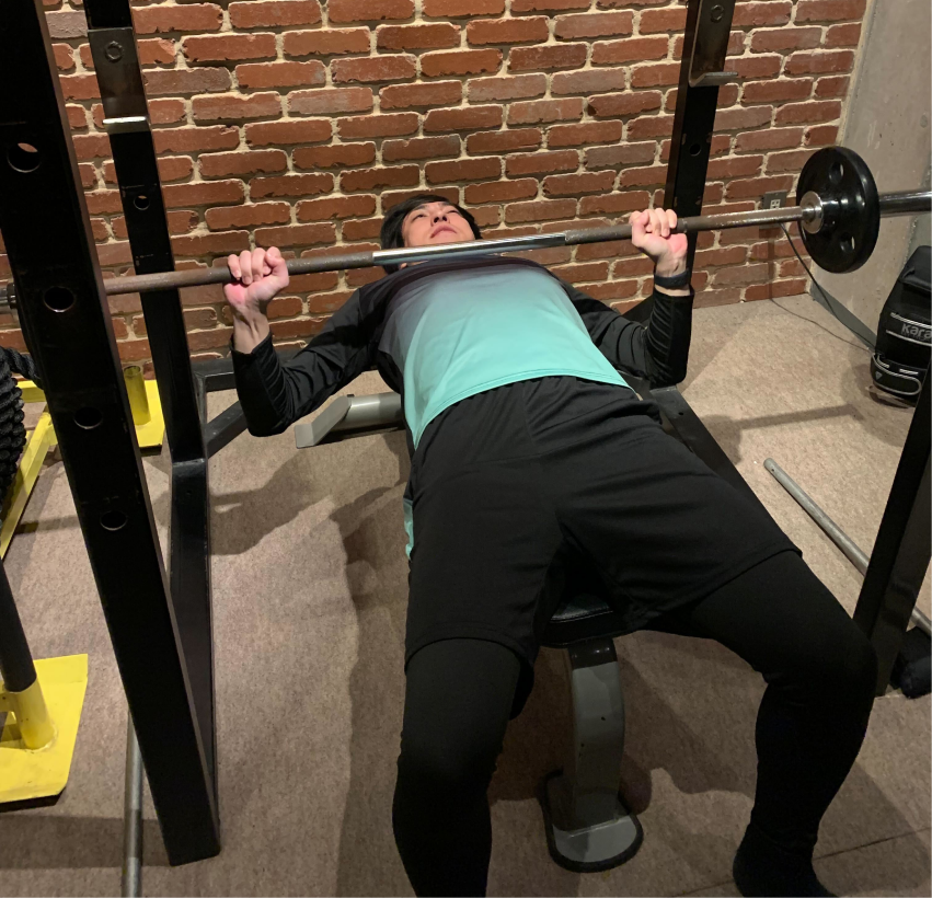 ストレッチが終わったらベンチプレスから始めていきます。足の位置がとても良いですねぇ。胸がもう少し張れると負荷を最大限に載せられるます。今後に期待しましょう。