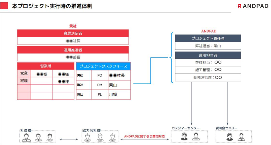 川鍋:提案内容によって異なりますが、私たちが作成した業務フロー改善チェックシート、現状の業務マニュアル、図面チェックマニュアルなどのツールの使い方を含めたロールプレイングをはじめ、営業会議に参加してファシリテーションを行ったり、データ分析の結果を共有したり、といった様々な関わり方をしています。支援がスタートしてからは、取り決めした内容や施策が浸透しているかどうかを調べるモニタリングも実施しています。その中で、次の課題を拾うアクション、モニタリング、仮説立ても行っていきます。お客さまの経営課題を解決するため、業界のトレンドや課題感を素早くキャッチし、ANDPADをはじめ各種チェックシートやマニュアル導入の検討などをいかに短いスパンで実施していくか。そして効果があったかどうかのジャッジまで、スピーディーにPDCAを回しています。