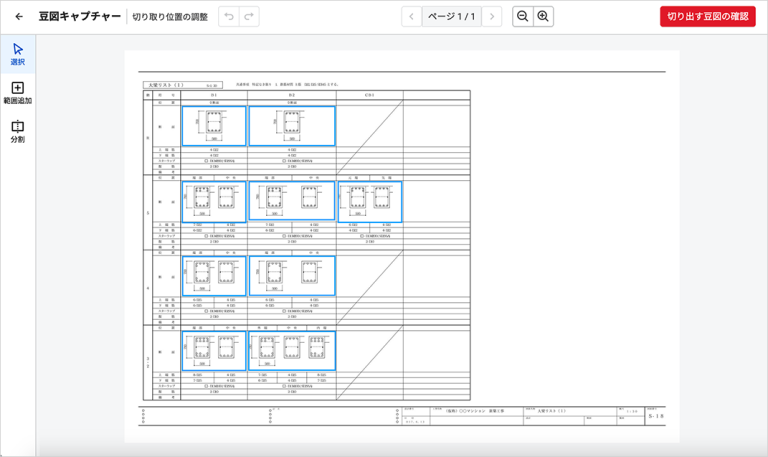配筋図のイメージでは 1 枚にいくつもの豆図があり、この配筋図が大量に存在するため、それぞれの配筋図から豆図を切り出す必要があります。