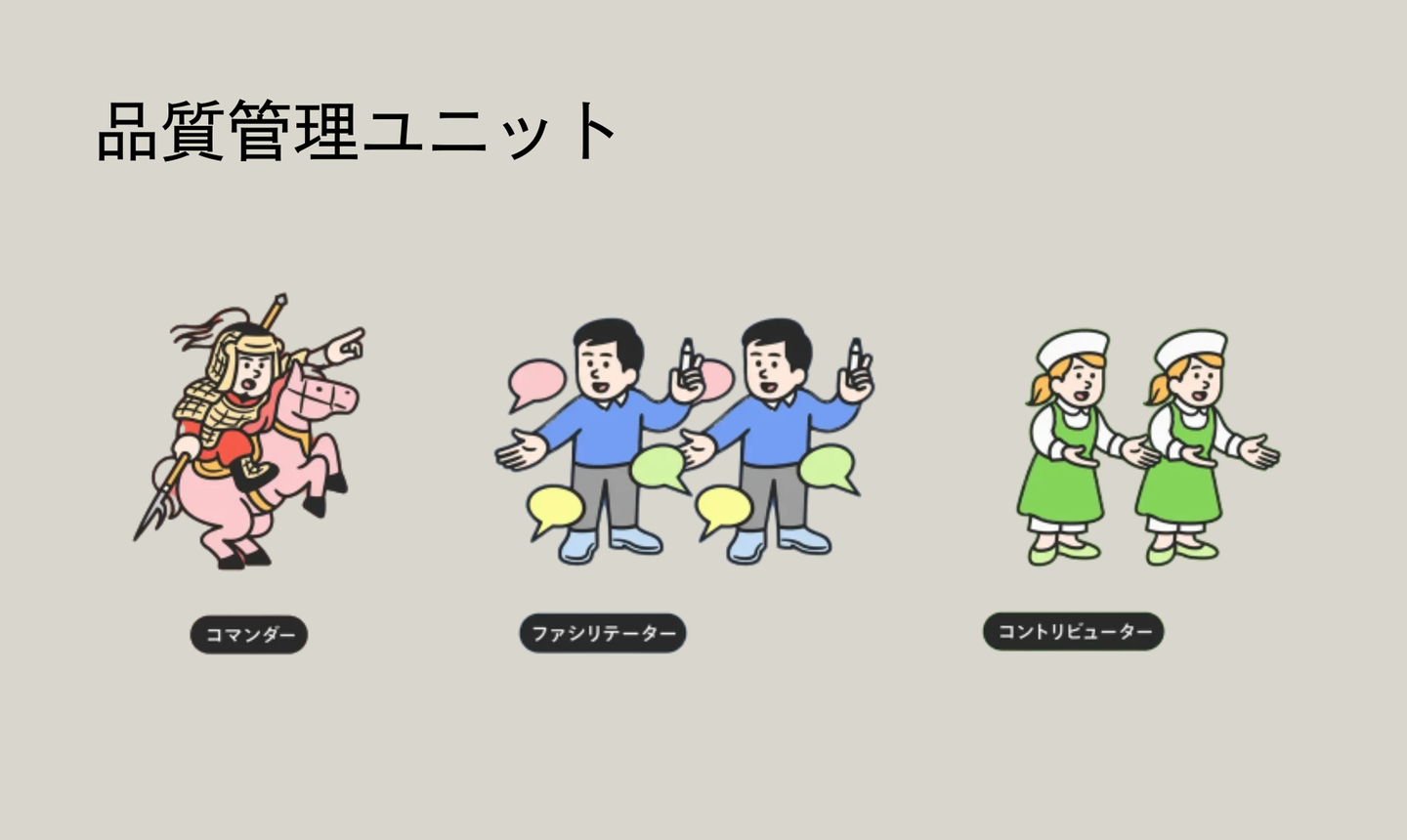 品質管理ユニットは、コマンダー(指揮者)×ファシリテーター(円滑者)×コントリビューター(献身者)で構成された、多角的な視点と安定感のあるチームです。