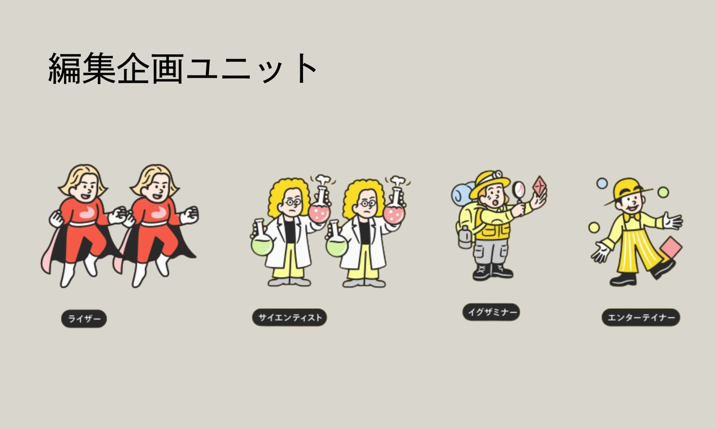 編集企画ユニットは、ライザー(奮起型)、サイエンティスト(科学者)、イグザミナー(考察者)、エンターテイナー(愛嬌者)で構成された、多様な視点と高い専門性を兼ね備えたチームです。