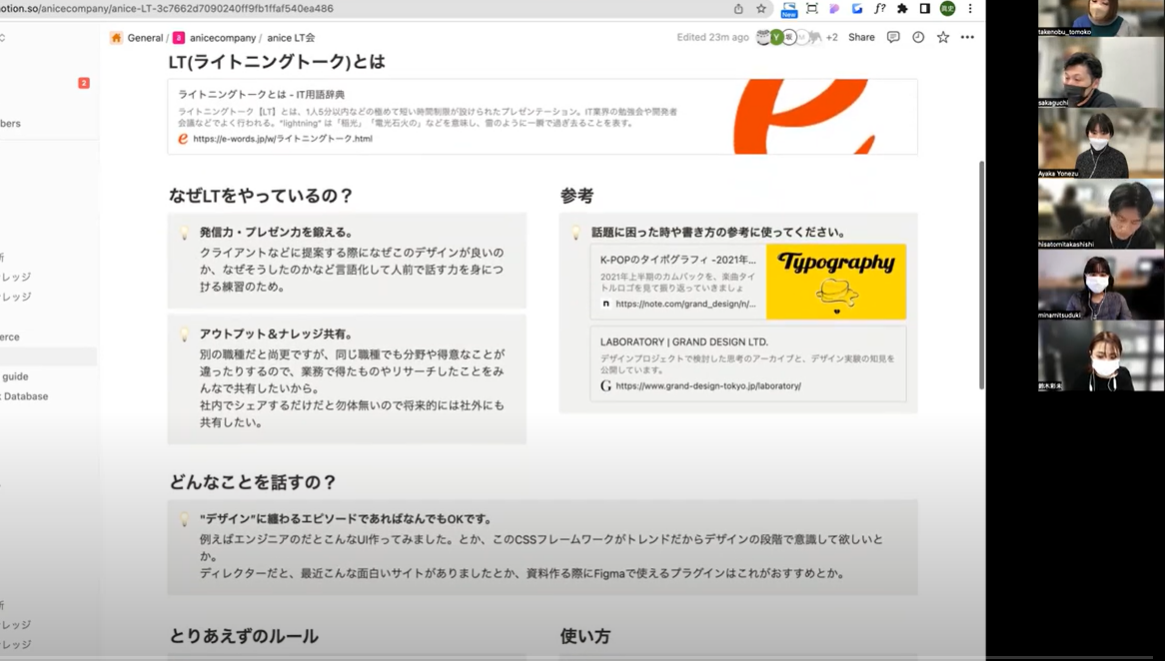 より良いアウトプットをし、お客様に喜んでいただくためには、社内でのスムーズな情報共有やそれぞれの役割や立場から見えるナレッジ共有が必要不可欠と考え、LT(ライトニングトーク)会を社内で始めてみました。また仕事のスキルアップだけでなく、普段関わらないメンバーの発表を聞くことでコミュニケーションの場としても活かしていきたいと考えています。