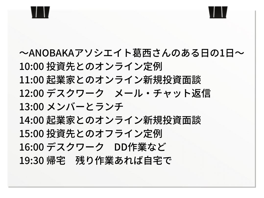 以上、葛西さんの1日に密着しました!思ったより忙しくないと感じたでしょうか、それとも大体予想通りでしたでしょうか?自分が担当している投資先の数や、その日のアポの数、直近のイベントの有無などによって忙しさは様々ですが、落ち着いている日のANOBAKAメンバーは概ねこんな感じです。というか、密着させてもらえる余裕のある日が、落ち着いている日でした(当たり前)。