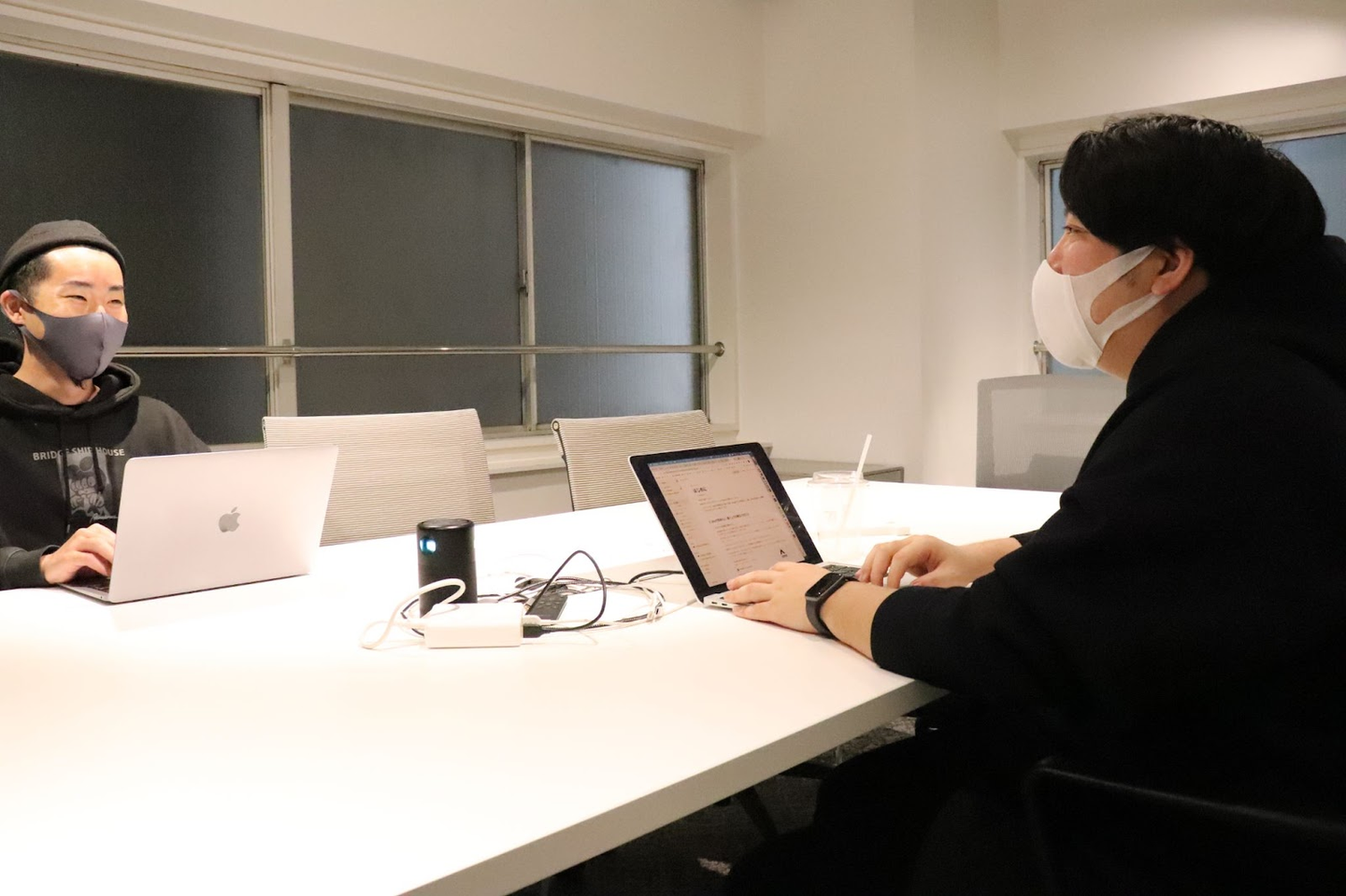 オンラインもあれば、オフラインもあります。会議室で1on1でしっかりお話を聞きます。密室に2人きり、張り詰めた空気なのでは…と思いつつ入室させていただきましたが、二人共笑顔多めの朗らかな雰囲気でした!葛西さんのお人柄がよく出ているなあ。