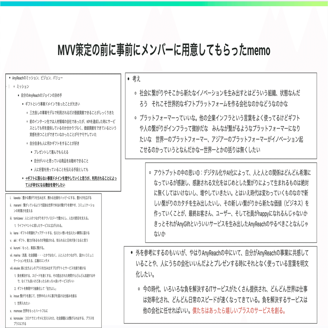 またその手前では、事前に各メンバーが大量にこういうものが良いのでは、こうあるべきを考えてきてくれていて、そのdocを読むだけでも感動的な内容が多かったです…