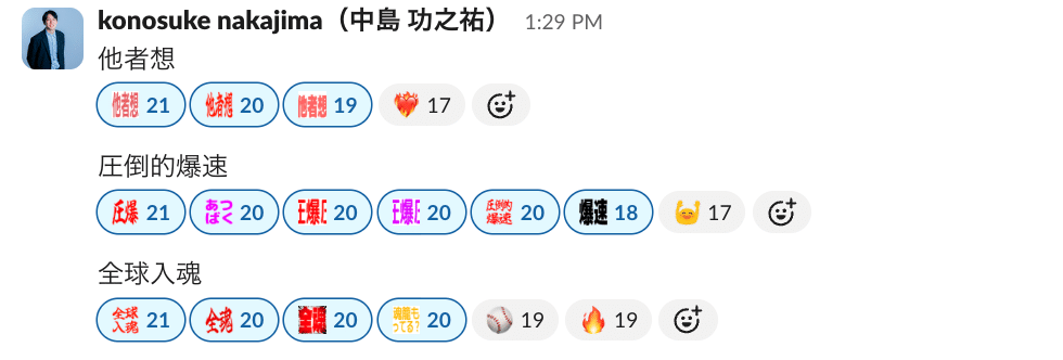 まずはslackのスタンプを大量に創り、言葉を使いやすいように略し、