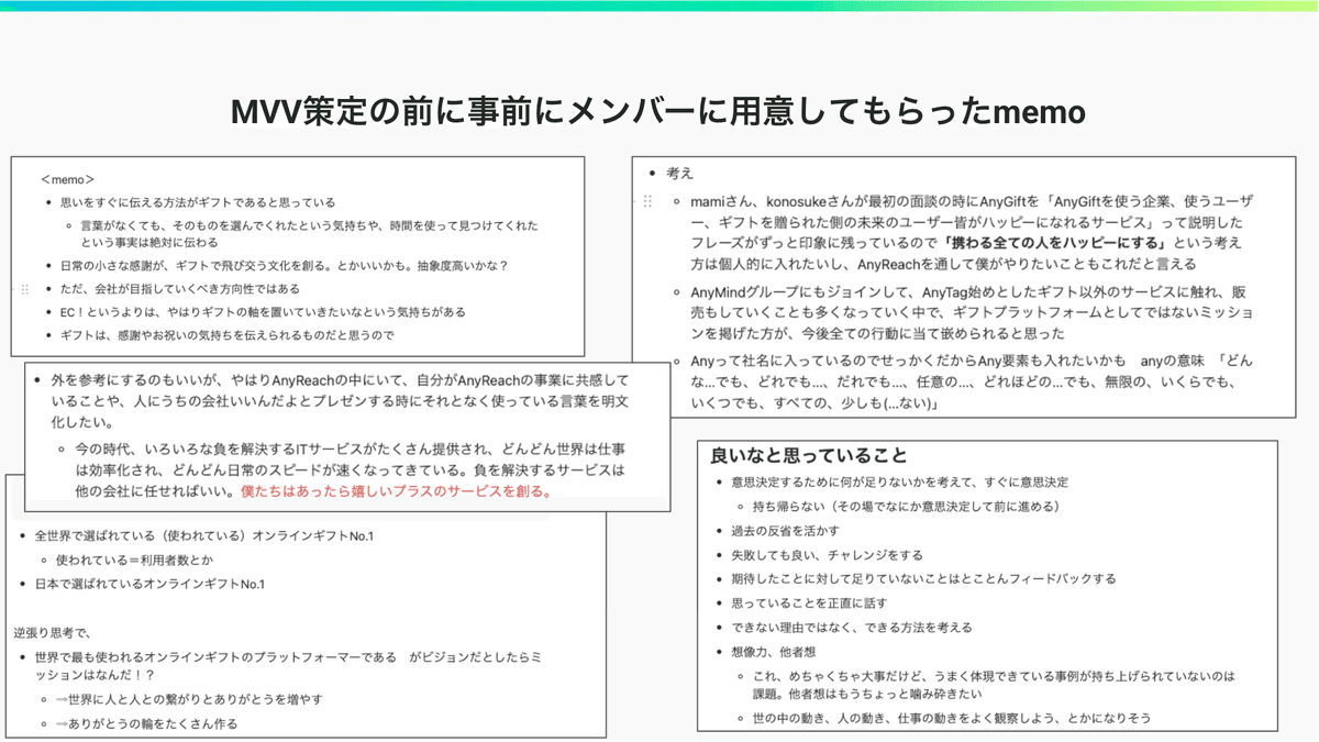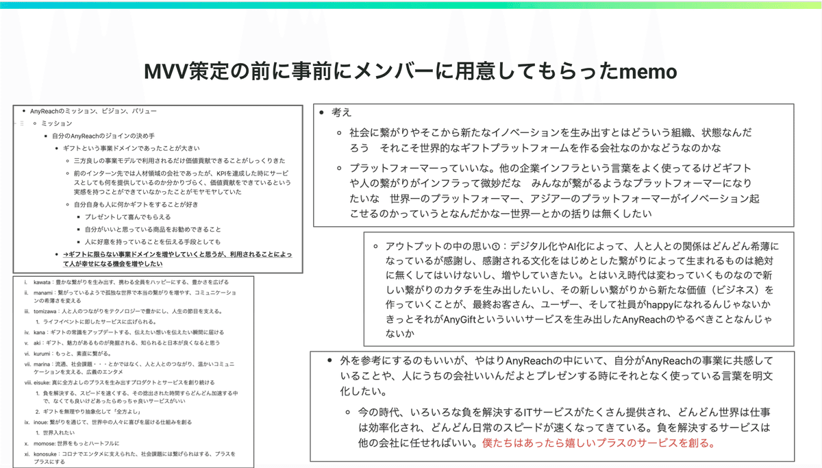 そして最後はびっくりするぐらい全員が納得を持って、MVVを決定することができた。その背景には、日頃からslackで使っている言葉とか、MTGで話している内容とかがすでに全員に染み込んでいたからだと思います。