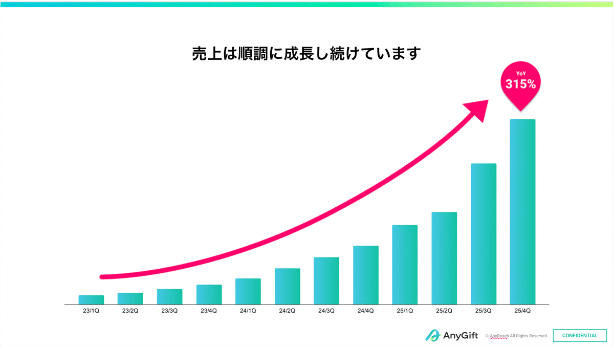 AnyGiftや、AnyGift Wedding、AnyCampaignなどの3つの事業も順調に成長を続けており、昨対比で315%以上の成長をしています。今年の12月の実績でさらに高い成長率で着地できる想定です。(T2D3の波に乗れています)