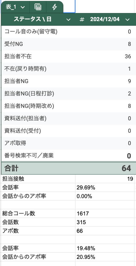 立ち上げ初期は、BDRの中でも特にアウトバウンドコールを中心に行っていました。そのため、1日にどれくらいの行動量があり、どこに課題があるのかを可視化できるスプレッドシートを作成しました。これにより、「何をどれだけ行えば、目標に必要なアポイント数を獲得できるのか」が明確になり、マネジメントも数字ベースでできるようになりました。