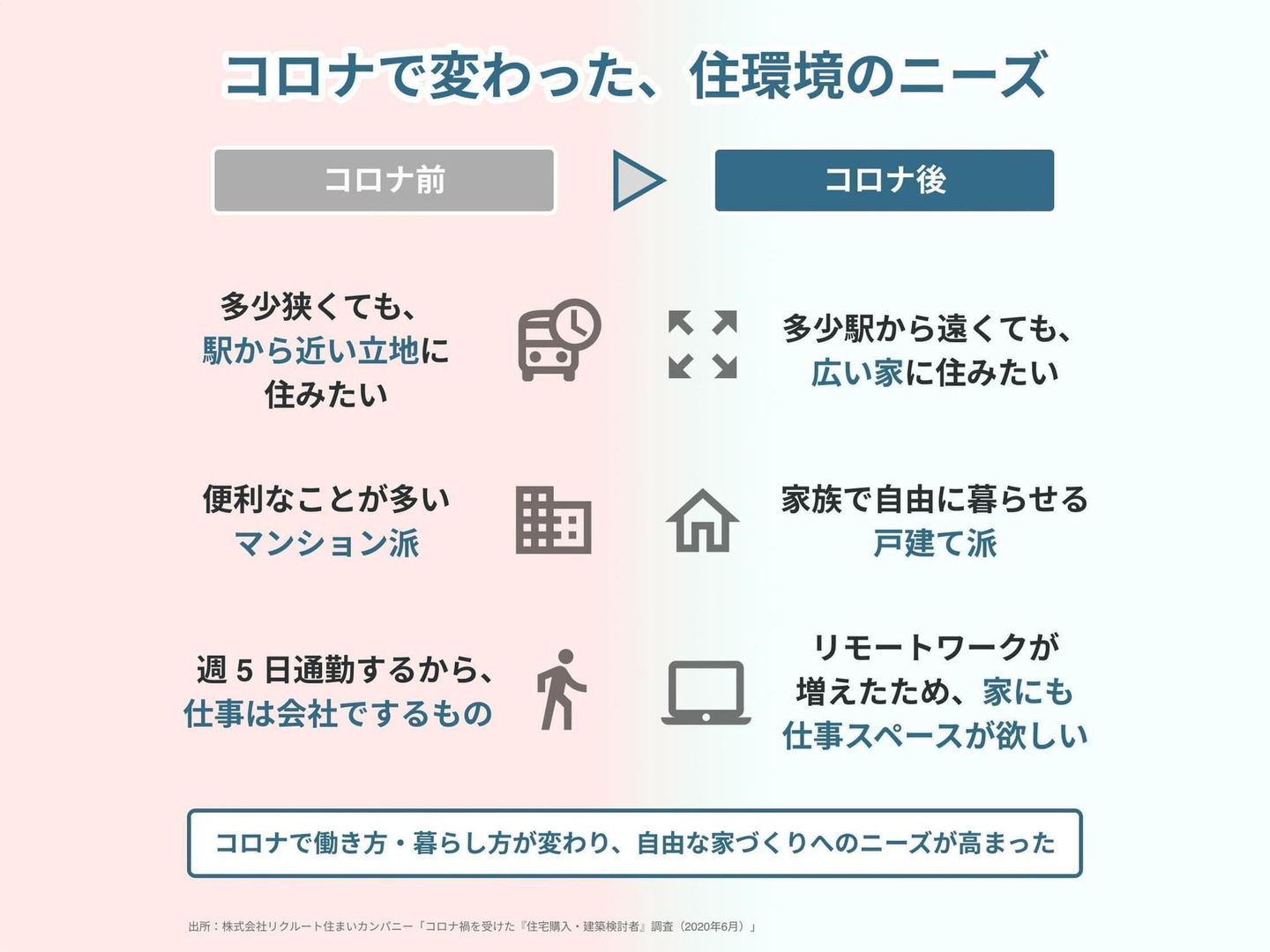 今までは週 5 日出勤を前提とした「アクセス」が家選びで重視され、主要駅から徒歩 10 分以内のマンションを選んだり、手狭でも駅近の区画にハウスメーカーの規格住宅をおさめたりするのが王道な住環境でした。