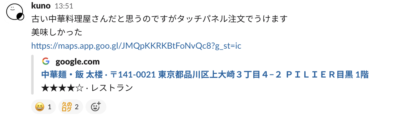 良い店を見つけたら slack に報告したりとかしてます。