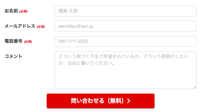 titel は家づくりをしたい顧客からの問い合わせを集めたいので、当然ユーザー側が私たち運営に連絡する手段が必要になります。電話番号やメールアドレスを直接載せたりしてもよいですが、必要な情報をまとめて集める意味も込めて「お問い合わせフォーム」があるサイトを目にすることが多いと思います。