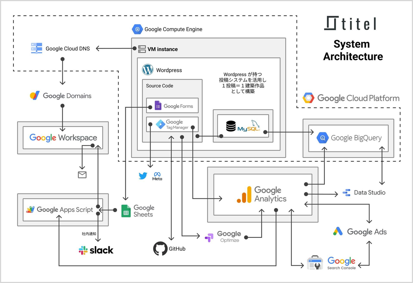 実際に titel で使った Google のインフラ・サービスの内容をそれぞれ説明していきます:
