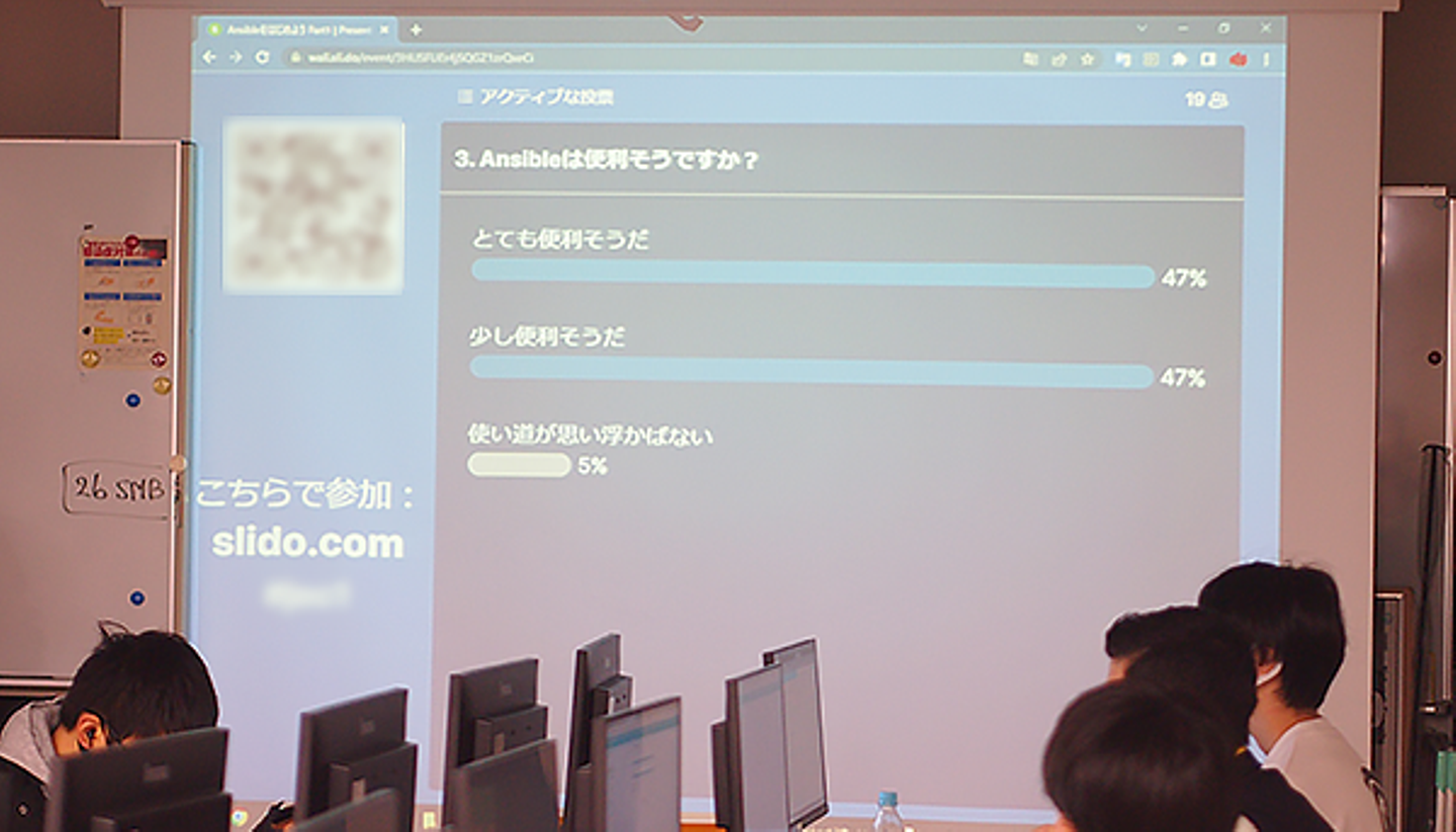 説明の途中で「Ansibleは便利そうだと感じますか?」とアンケートを取った際の結果を見ると、