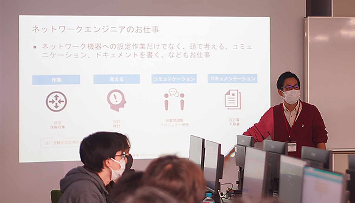 まずは「そもそもネットワークエンジニアはどのように仕事をしているのか」から説明しました。