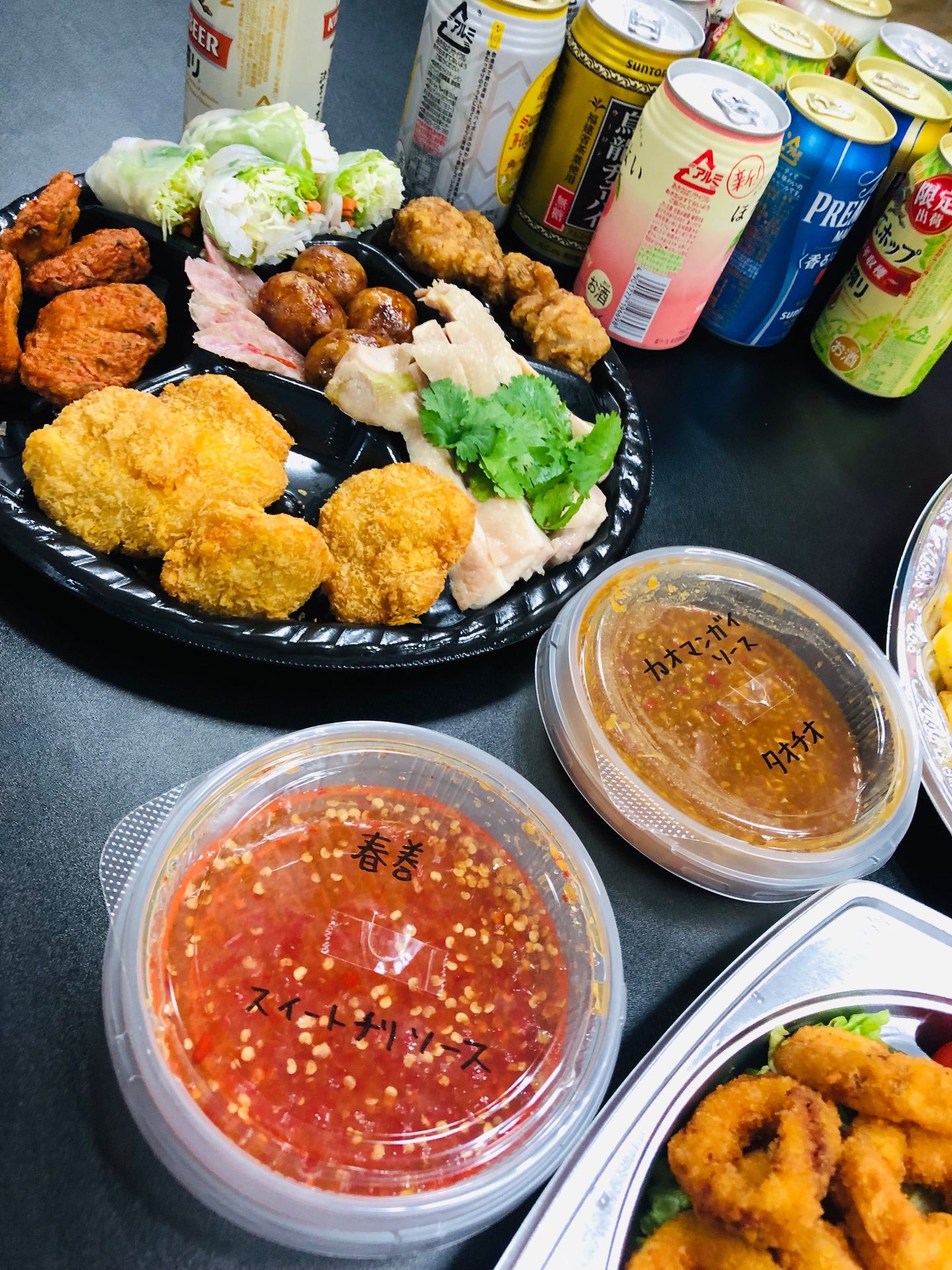 この日のメニューは横浜のお店からデリバリーされた特大ピザ(TOP画像のものです!)と、エスニック前菜盛り合わせ、みんな大好き!唐揚げ&ポテト……等。