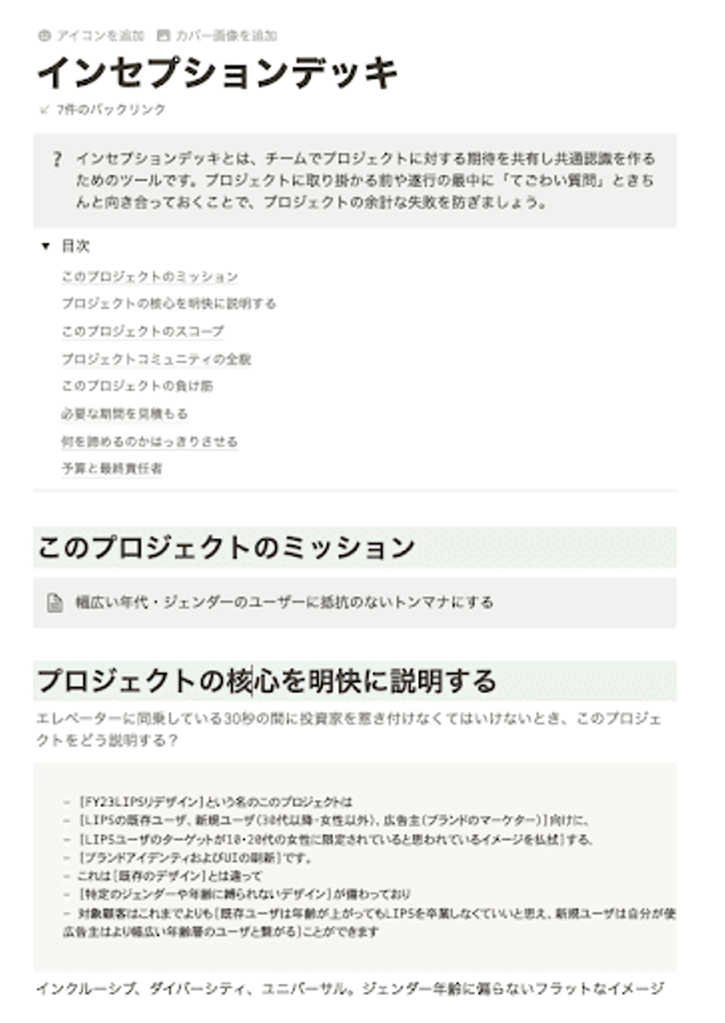 インセプションデッキは、アジャイル開発を取り入れたチームでは浸透しているフレームワークですが、はじめて目にするメンバーやプロジェクトに直接関わることのないメンバーもいます。そして、ここさえ見ておけば共通認識を揃えることができるようにする目的もあったため、補足や言葉尻を変え各項目が理解しやすいような表現にしました。
