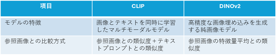 モデルはCLIPとDINOv2の2つを使用しました。それぞれの特徴は以下の通りです。