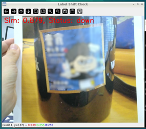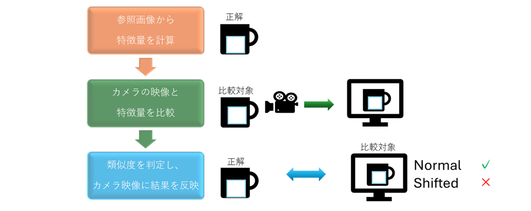 実験手法として、まず正解となる位置にシールを貼ったマグカップの画像を、角度を変えるなどして数枚用意しました。これらの参照画像から、それぞれのモデルを用いて特徴量を求めます。そして、Raspberry Pi※に接続されたカメラに撮影した映像(今回は同じマグカップでシールの位置を変えた画像)からも特徴量を求め、これら2つ比較しました。参照画像と一致する画像を「正解」、シールの位置を変えた画像を「不正解」とし、各画像の類似度を評価することで、ずれの検出精度を確認しました。