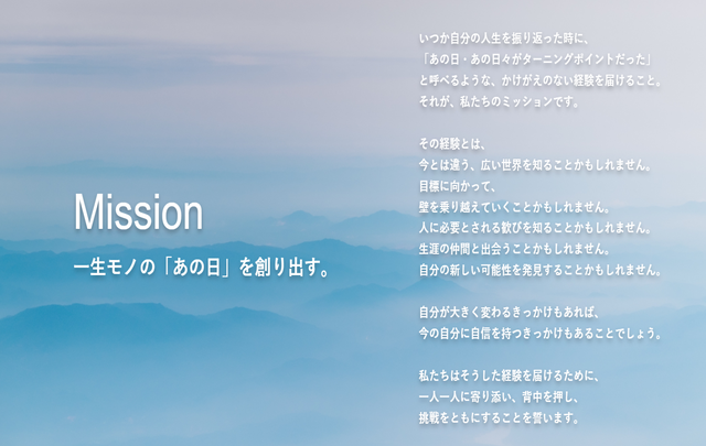 いつか自分の人生を振り返った時に、「あの日・あの日々がターニングポイントだった」と呼べるようなかけがえのない経験を、一緒に届けませんか?