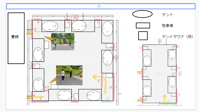 他には、車が進入しやすいようにテントの向きを配置したり、隣のテントとの距離・音はどの程度聞こえるかなど、色々な問題を想定したりして、平面図を作成しました。