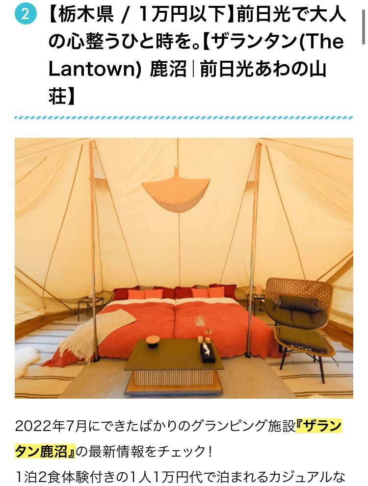弊社が持っている「GLAMPICKS」というサイトで、【関東】2023年最新/コスパ最高のグランピング施設17選!(2023年1月現在:180万PV)という記事を書き、そこにザランタン鹿沼を掲載したり、CANVAというサイトを使って、公式LINEのリッチメニューデザインの作成を行ったりしました。