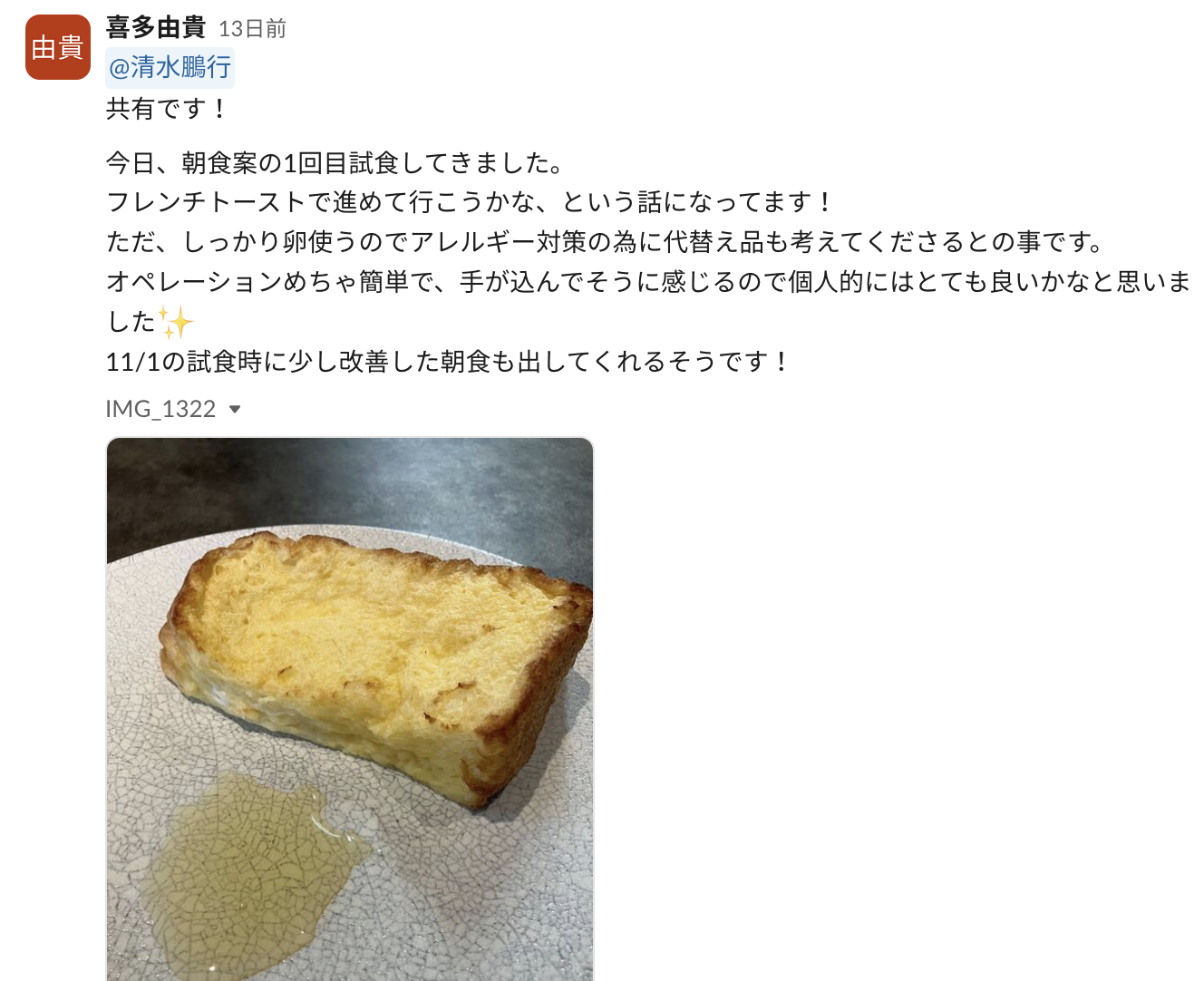 例えば、現在だと中心業務として「朝食メニューの開発」や「開業に向けたスタッフさんの採用」を行っています。