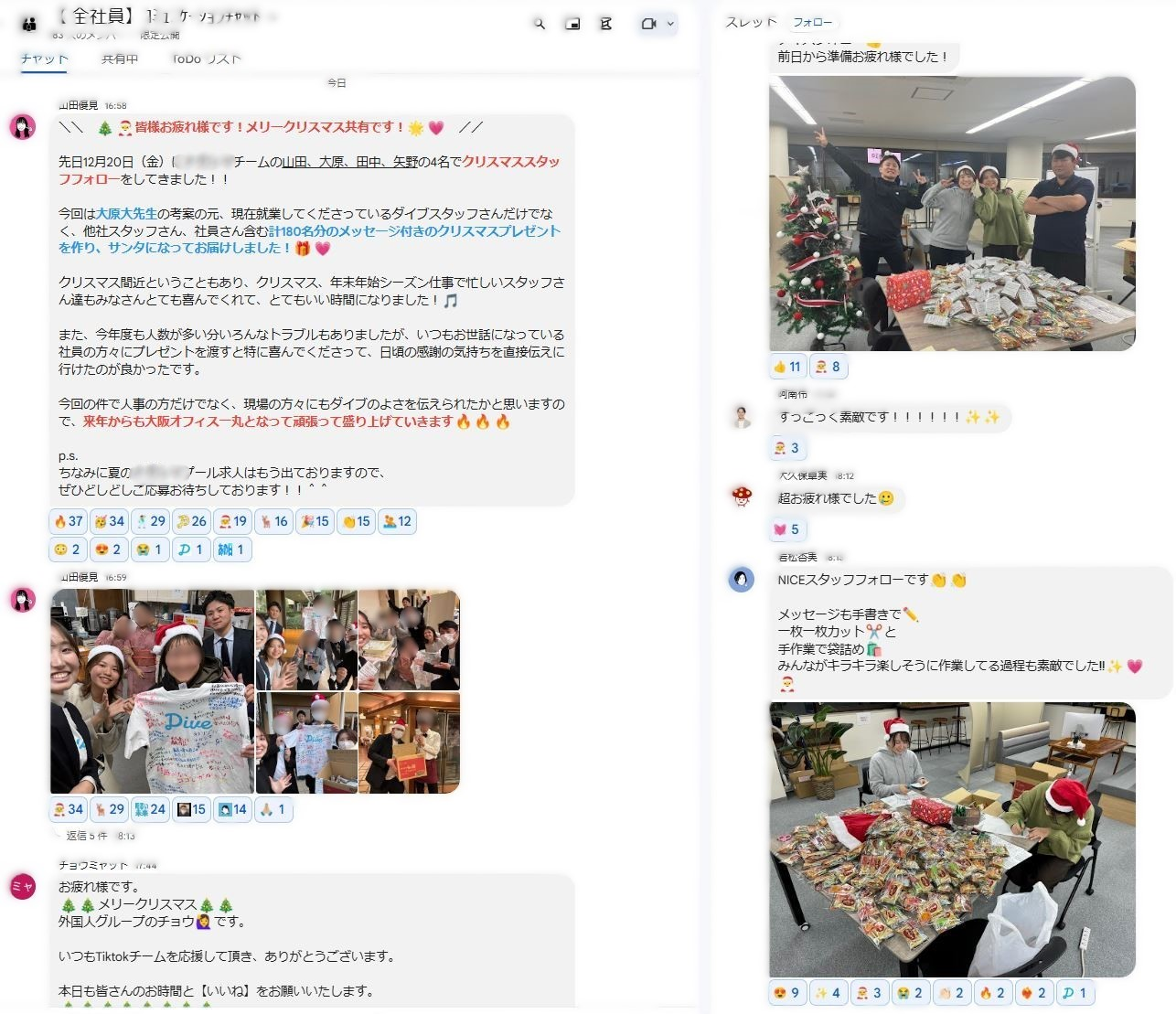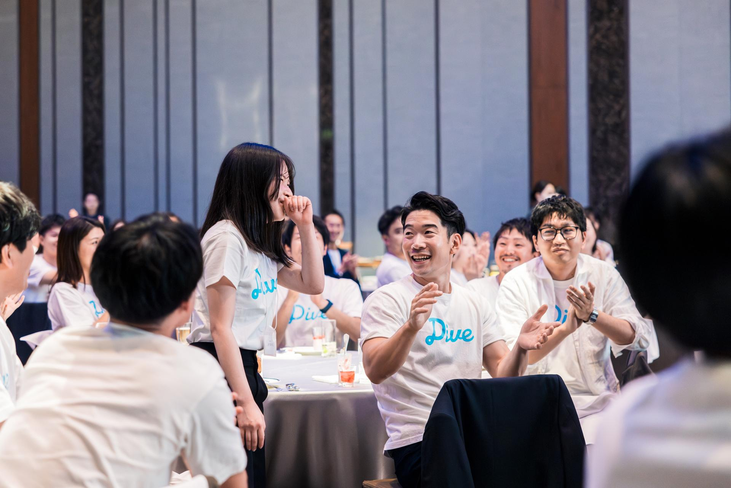 全社員がいる「全社コミュニケーションチャット」では、誰かが発言してほんの3秒くらいでリアクションが付く。絶対否定せず受け止めてくれる環境がダイブにはあります。