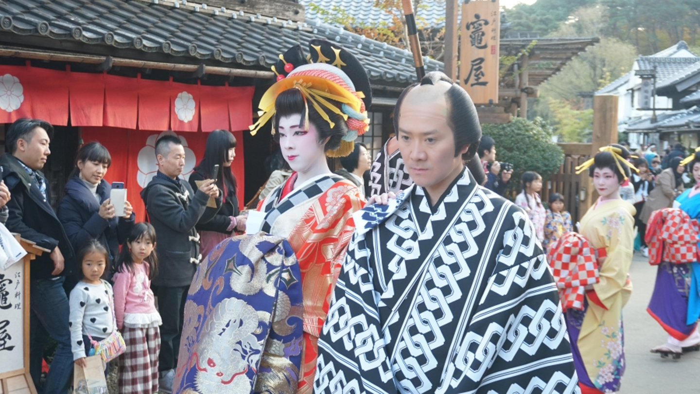 こちらは花魁道中の様子ですね。花魁(おいらん)がゆっくりと江戸の町を練り歩きます。独特な足さばきと優雅な振る舞いが特徴です!