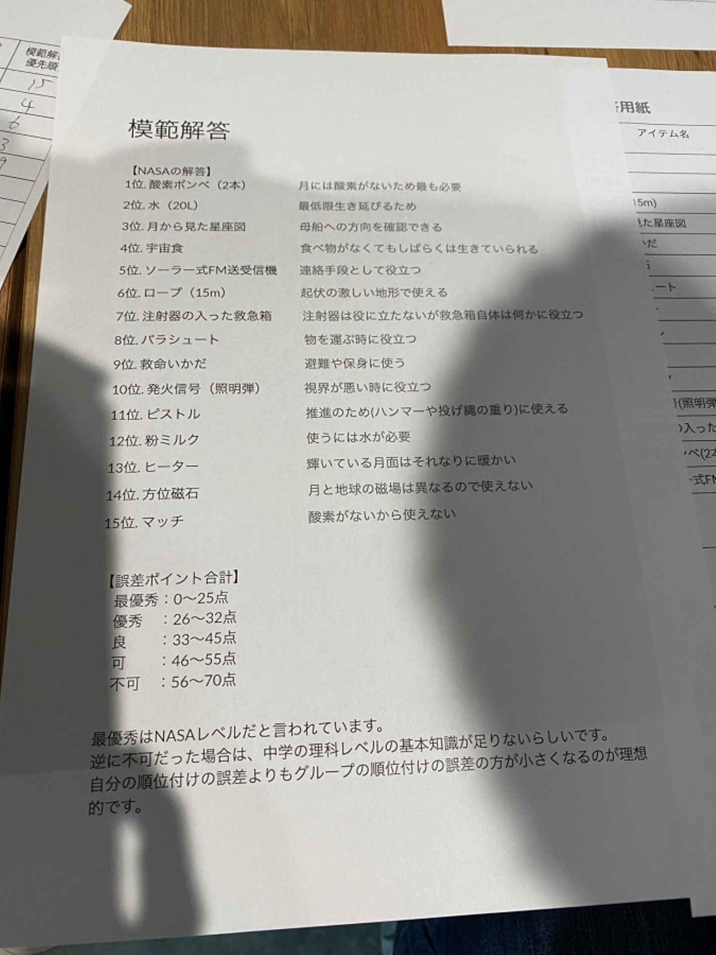 →水よりも優先にした。チームメンバーの若杉さんが水分を含む宇宙食があると言いチームメンバー全員を納得させ2位。