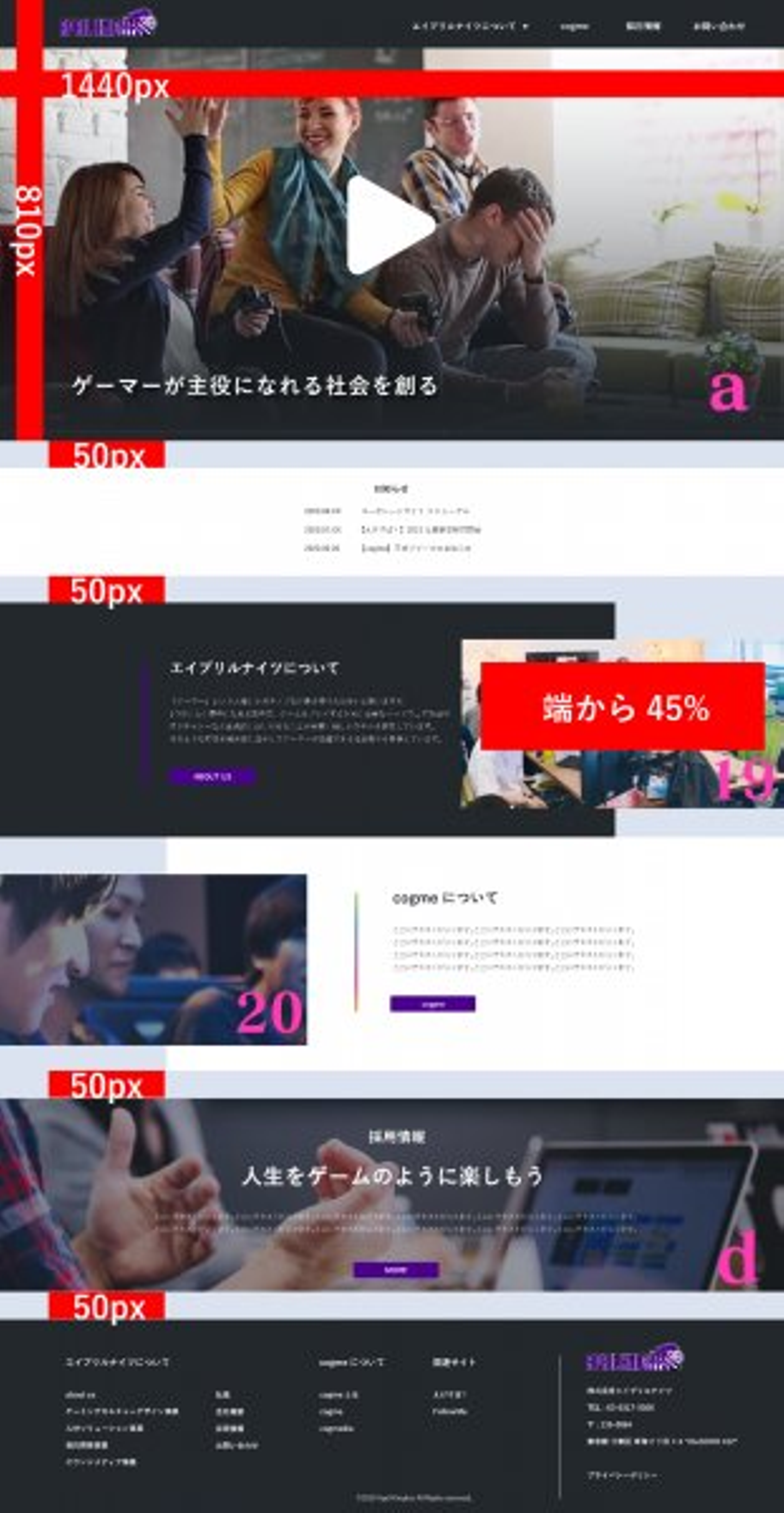 エイプリルナイツコーポレートサイト改修では主にワイヤーフレームとデザインカンプの作成を中心に色々なことをやりました。