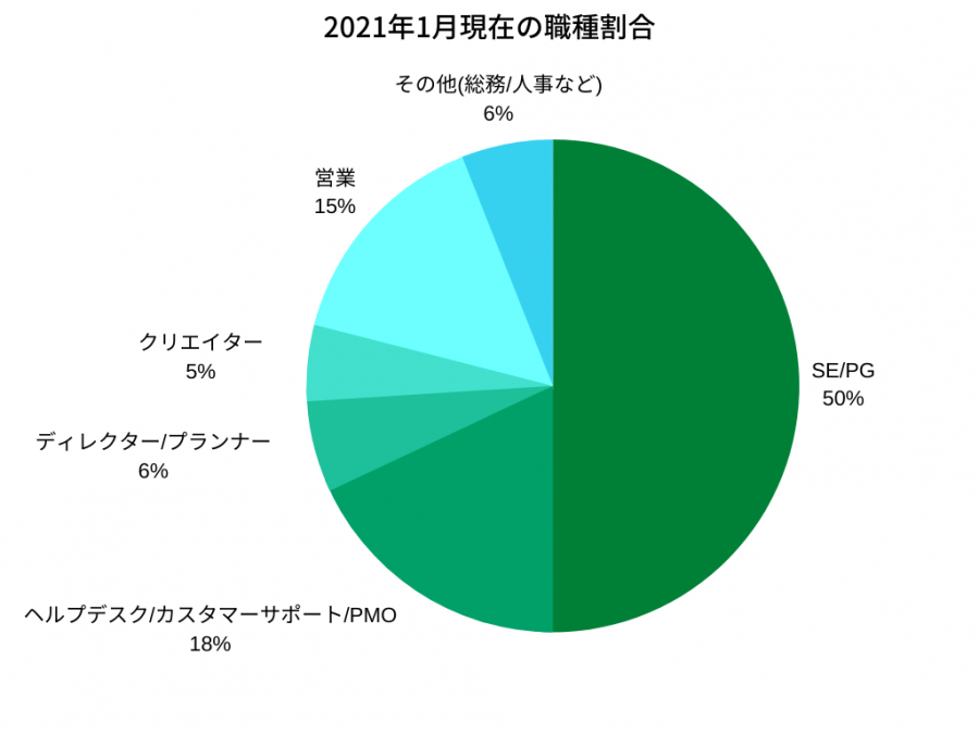 ちなみに全社員約70名(2021年1月現在)の職種の割合は以下の通りです。