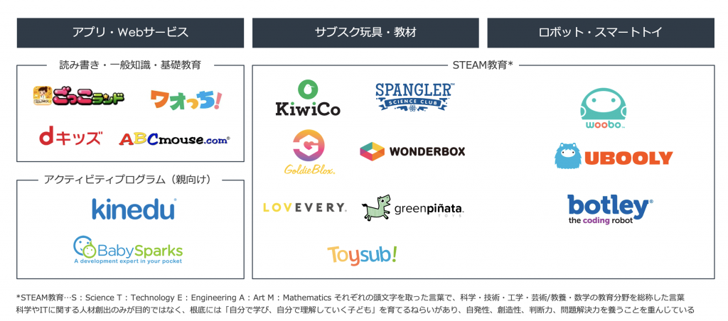 また、知育領域で特に注目すべきはSTEAM教育系のサービスです。STEAMとは、S : Science T : Technology E : Engineering A : Art M : Mathematicsそれぞれの頭文字を取った言葉で、科学・技術・工学・芸術/教養・数学の教育分野を総称した言葉です。