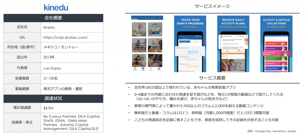 Kineduは、赤ちゃんの月齢に合わせた発達を促す遊びなどを、毎日動画やコラムで紹介してくれるアプリです。アクティビティの達成状況に応じて、発達状況の診断と今後どんなスケジュールで何をするべきかのマイルストンを提示してくれます。既に、全世界180カ国以上で使われており、赤ちゃんの発育促進アプリとしてはかなりメジャーなサービスです。